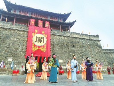 红脸的关公舞大刀,黑脸的张飞卖腊肉,风度翩翩的刘备晒草鞋……11月1日上午10时,由市融媒体中心、市传媒集团精心打造的“千年一城满风华”之《三国英雄路·我在荆州演三国》实景互动演出在古城大北门上演。