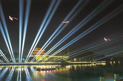 荆州是凤凰的故乡,志在凤鸣九天。伴随着悠扬的琴声,4只翼展4米、头尾长6米的光影凤凰从城墙下翩然起飞,在夜空中翱翔,姿态曼妙,熠熠生辉。