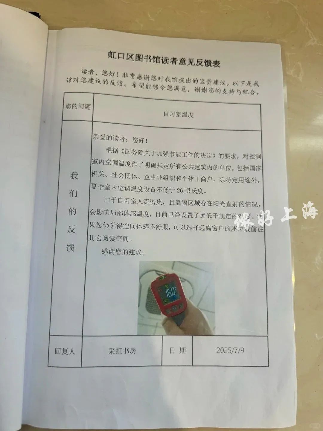 图书馆认真回复:空调是根据国家规定不低于26度设置的,但鉴于部分区域读者较多,且有阳光直射,已经把空调温度又调低啦。(回复居然还有配图,这一看,真的已经调得很低啦,够人性化!)