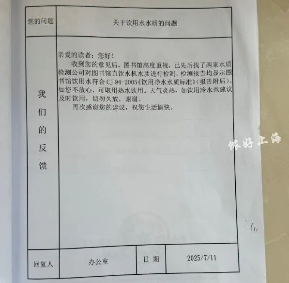 图书馆回复:马上找检测单位,进行水质大检测,净水报告来啦!