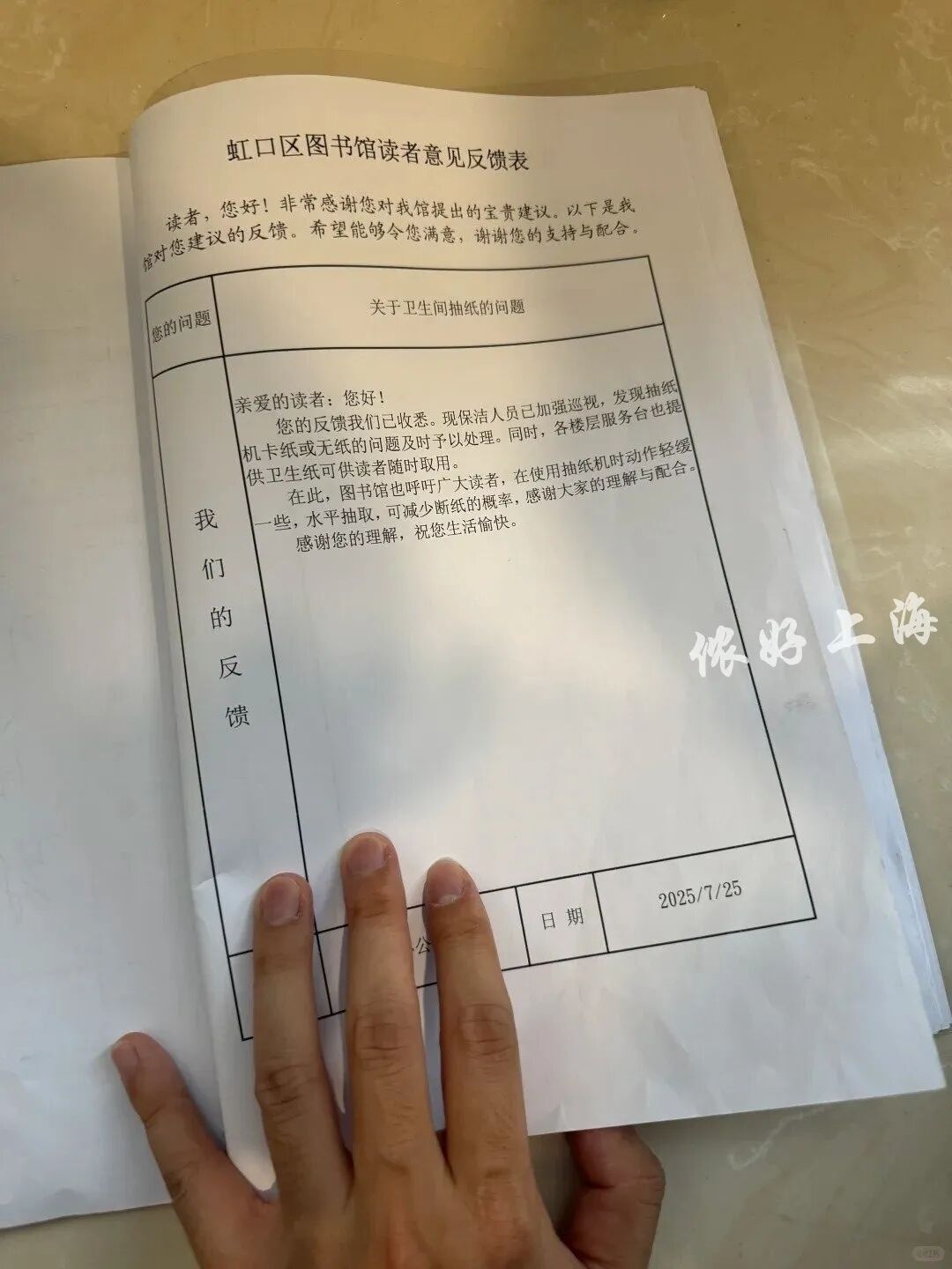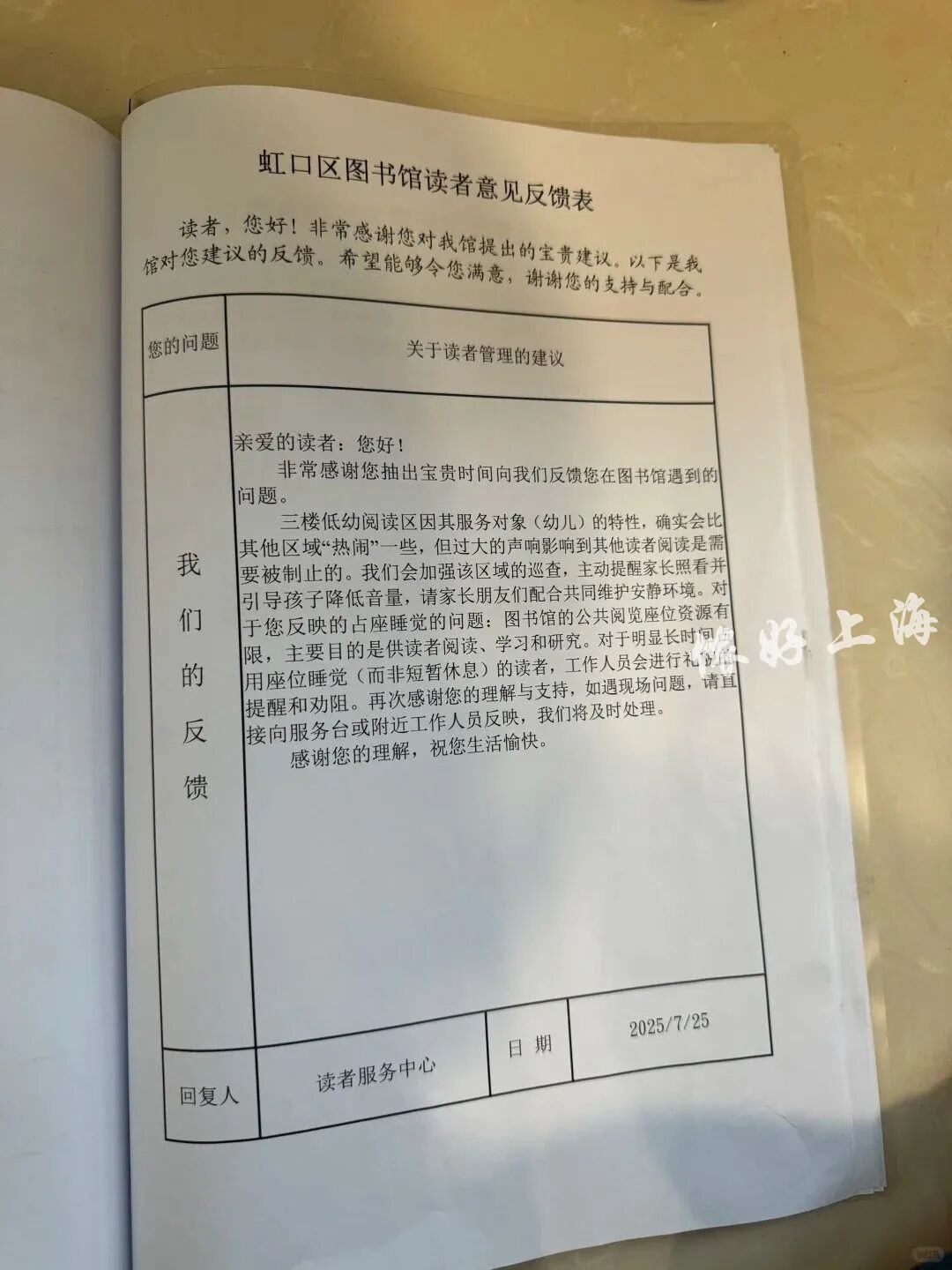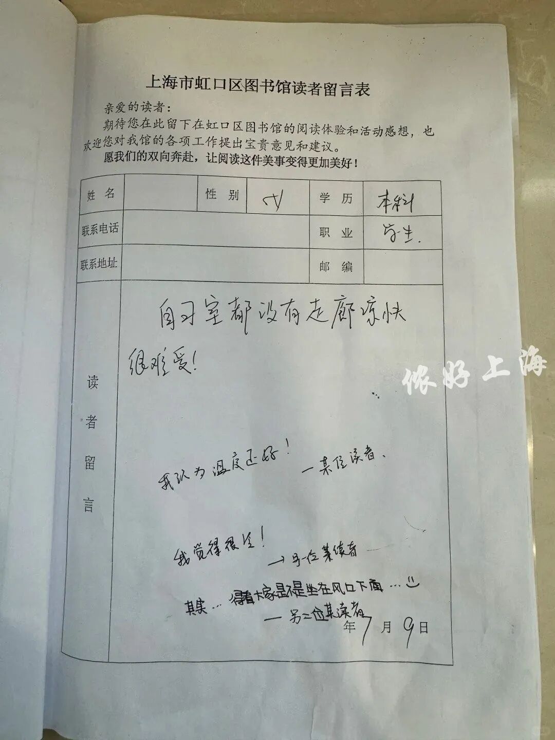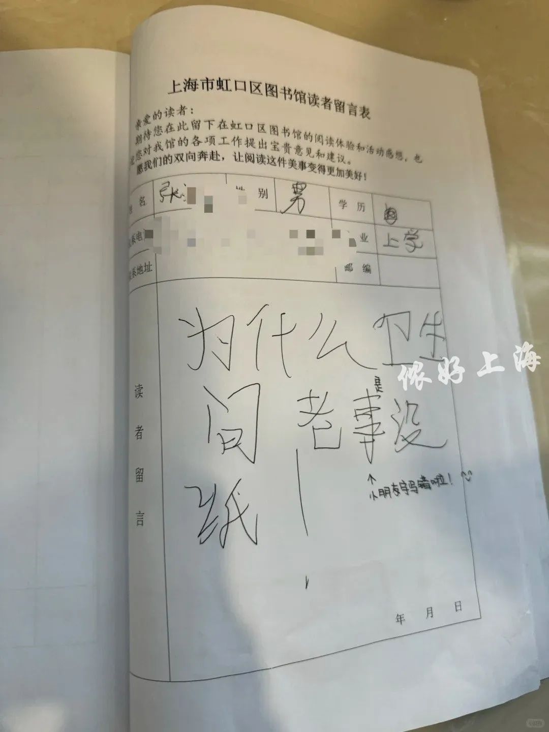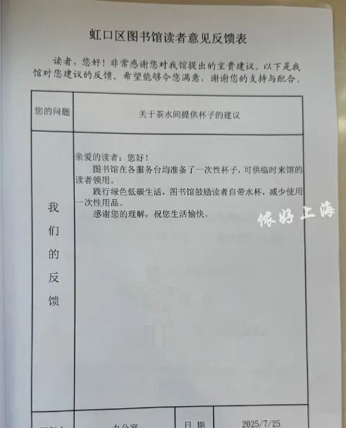 虹口区图书馆这本留言簿受到全网热赞,恰恰说明还有不少留言簿上,回复一栏仍是空白,热切期盼着被填上。而正是在这些不起眼的小细节里,藏着一座城市最顶真的态度。