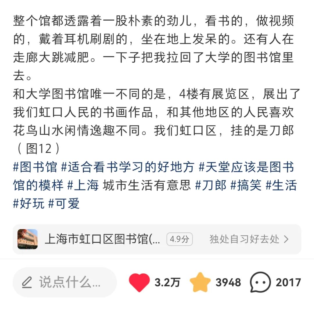 博主小邢表示,她和男朋友小于最近去逛了逛家附近的虹口区图书馆(位于水电路1412号的总馆)。本来以为,这里是给退休老头老太太乘凉的地方……结果到了楼上,意外地发现不仅设施很齐全,而且人们都在认真读书,一切都井井有条。
