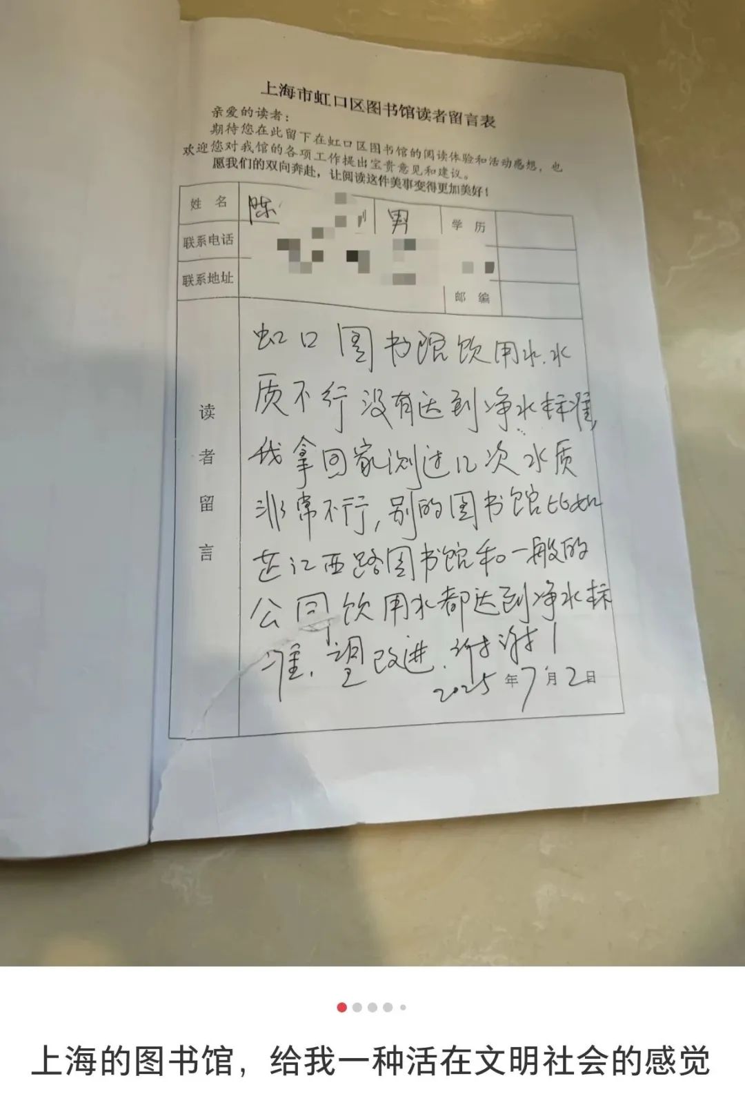 周副馆长:其实所有图书馆都有留言簿,这是我们为读者提供的一个反映诉求的渠道。留言簿这个载体本身是很传统的,并不稀奇。